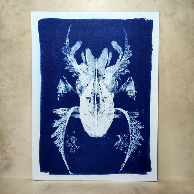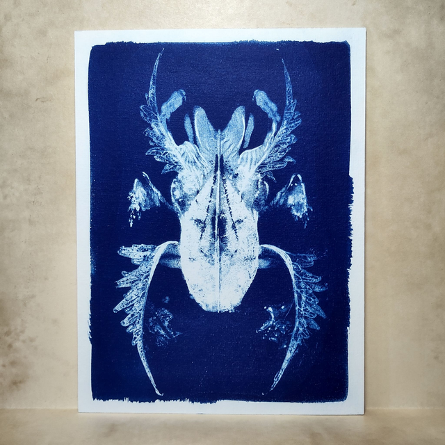 Cyanotype d'une empreinte à la gouache représentant une araignée, tamponné, daté et signé au dos.