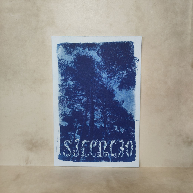 Superposition de photographie d'arbres de Brocéliande et du mot Silencio, d'après un alphabet du XVe siècle, Cresci, Italie.