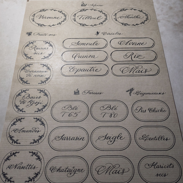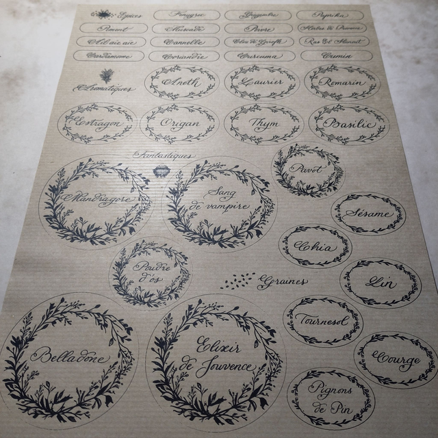 Imprimées sur papier kraft 90g/m², ces étiquettes en calligraphie anglaise, sont parfaites pour décorer pots et bocaux dans la cuisine ou sur vos étagères sorcières.