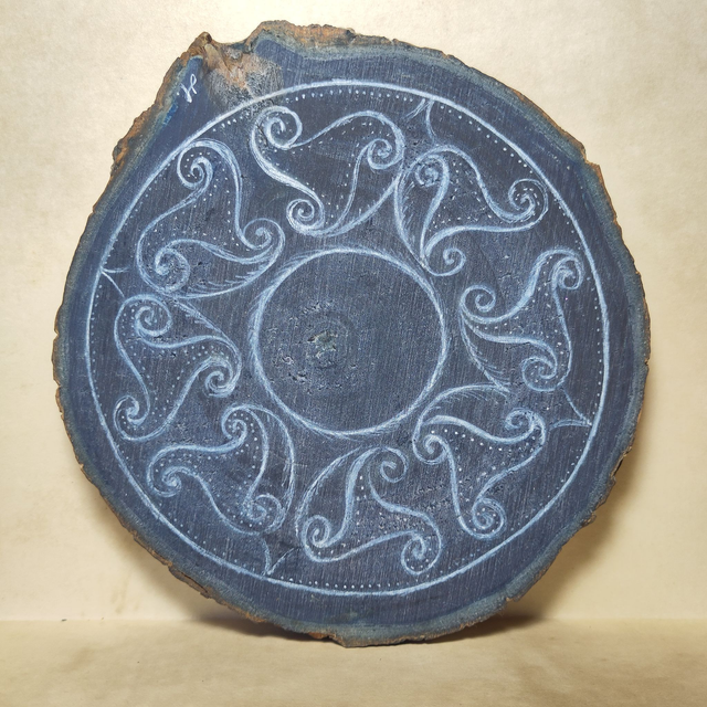 Cyanotype sur bois : rondin diamètre 14cm, 15mm d'épaisseur, retouche à l'acrylique blanche, signé.